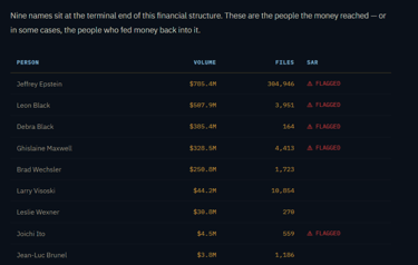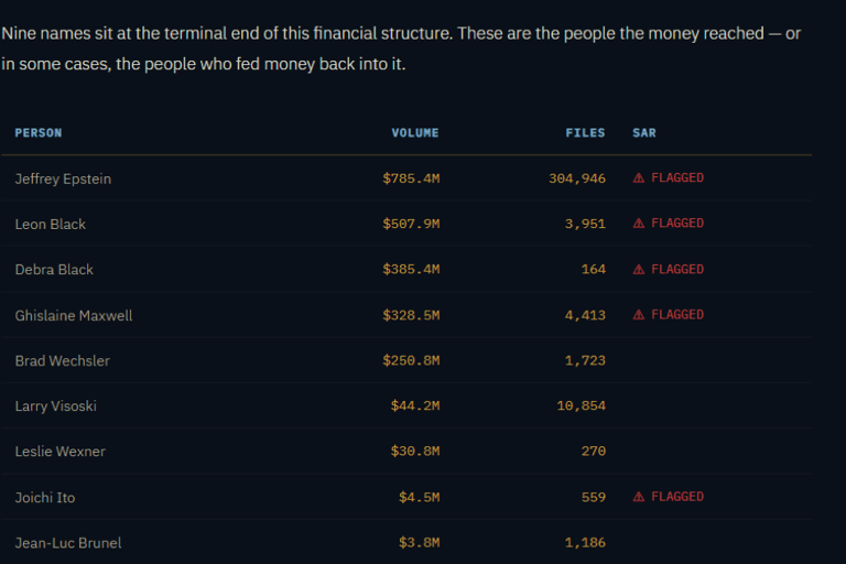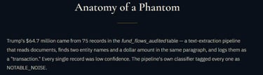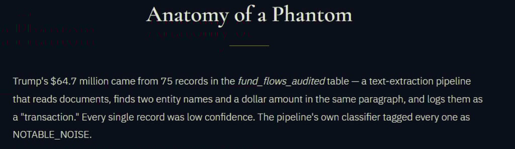 In short, the Natural Language Processing (NLP) model used to collect the data appeared to have treated names and dollar amounts appearing near each other in text as if they were financial transactions, even when they came from news articles or legal filings. Those low‑confidence extractions were aggregated and published before being verified against actual bank documents, so under proper review, the claimed totals collapsed. Eight individuals with a combined attributed total of over $144M, were subject to subsequent clarification which showed their totals came from NLP name-and-dollar co-occurrences in the document corpus, not from bank records.