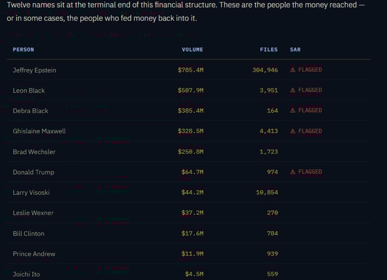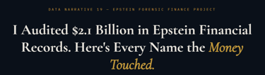 Version One of the webpages claimed that USD $2.1 billion in financial records connected to Jeffrey Epstein had been audited and that individuals involved had been identified in the analysis. The page formed part of the “Epstein Forensic Finance” repository and contained narrative material asserting conclusions regarding financial transactions and associated individuals.